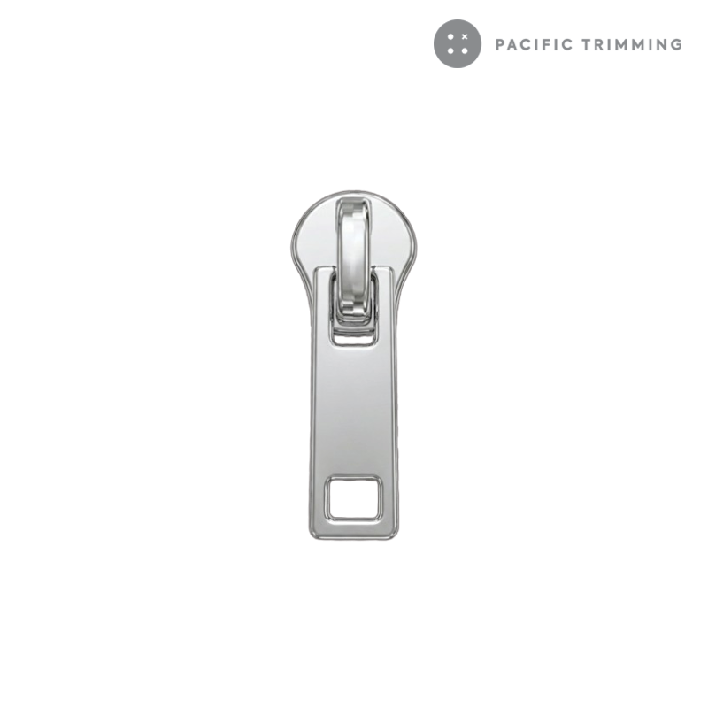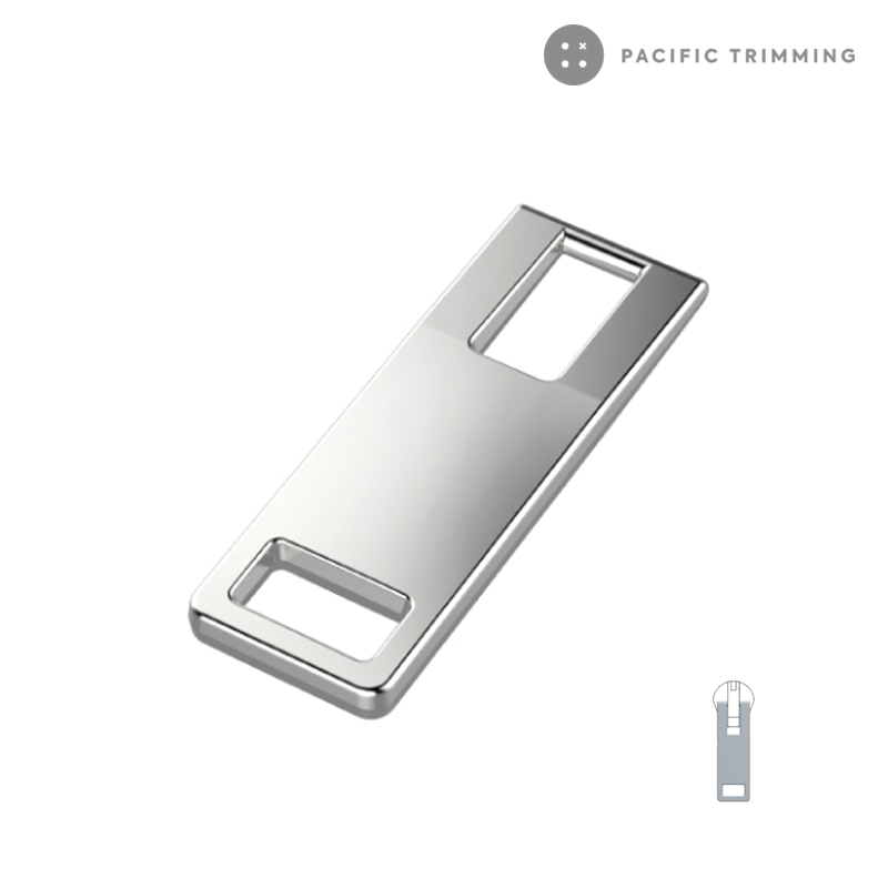 The GLATT is a rectangular zipper puller characterized by a sleek, minimalist metal design with geometric cutouts. It is available in small, medium, and large dimensions.